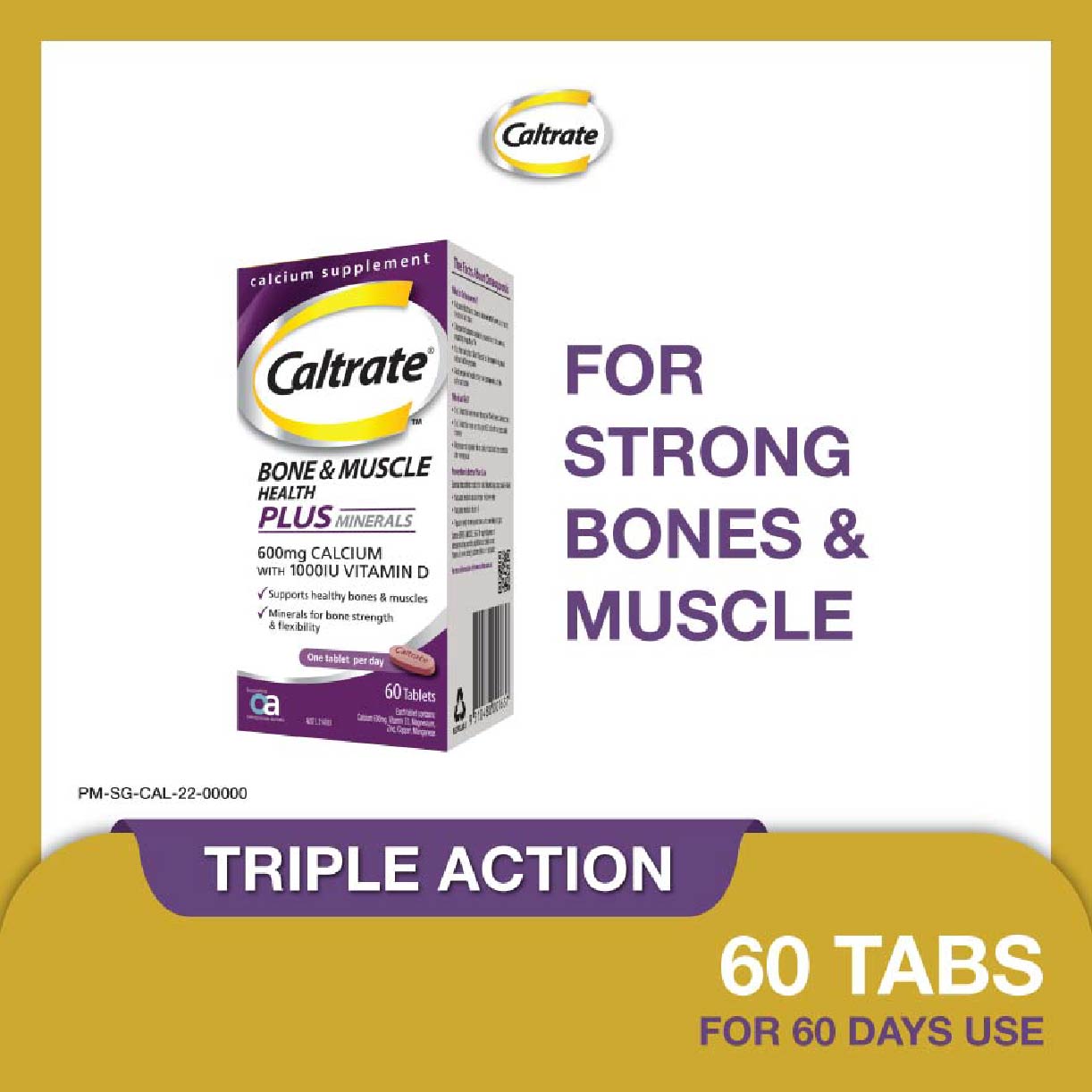 Caltrate® BONE & MUSCLE HEALTH PLUS MINERALS contains, 600mg elemental calcium, 1.5x more Vitamin D at 1000IU and 4 bone fortifying minerals for stronger bones and greater mobility
