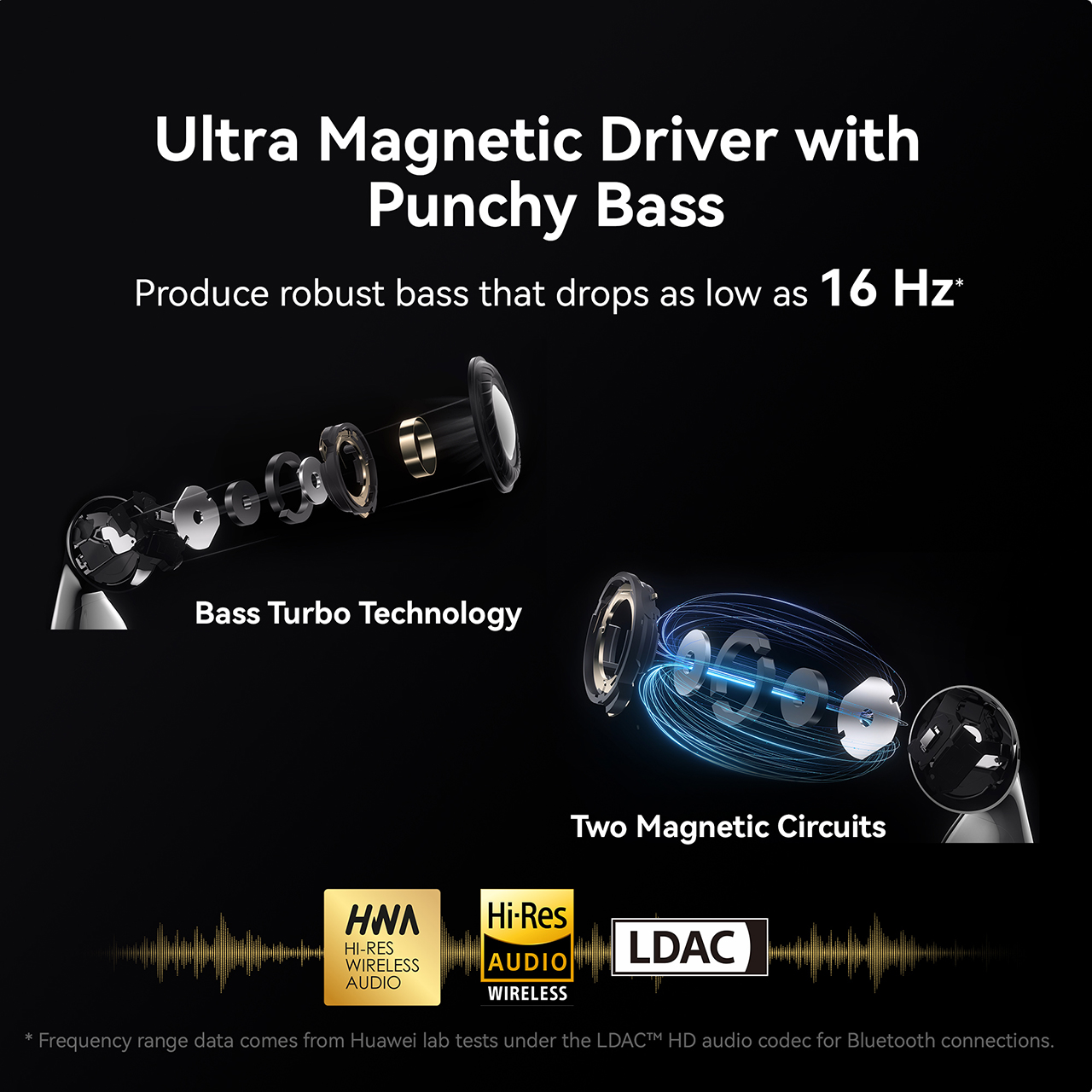 - Ultra Magnetic Driver with Punchy Bass | HUAWEI FreeBuds 5 is 30%2 more sensitive at low frequencies than HUAWEI FreeBuds 4, and produces robust bass that drops as low as 16 Hz3. These earbuds pack even more punch, by boosting airflow while reducing the resistance the diaphragm experiences during vibrations, thanks to proprietary tech and a custom tube.