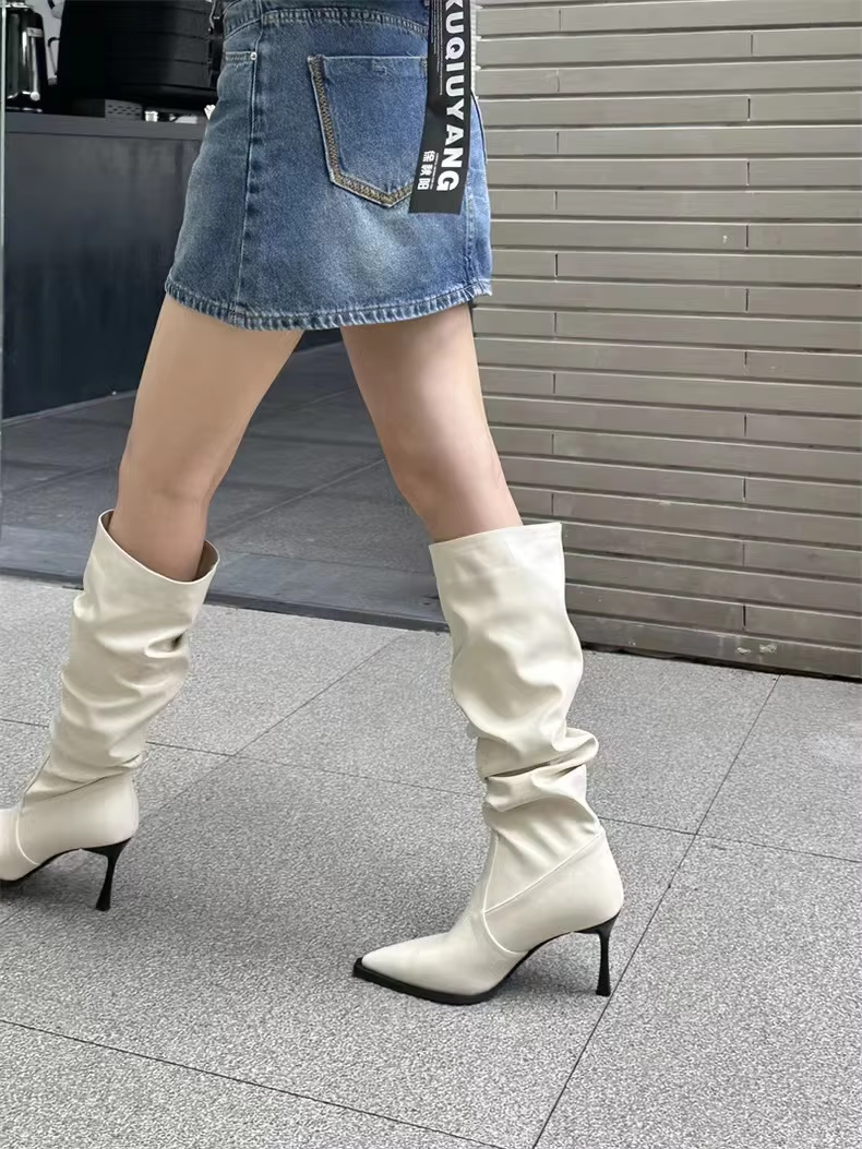 2024 Sharp Pointed Retro Fashion Women's Shoes Hot Sell Long Tube Pleated Women's Boots Look Slim Sexy Trendy High Heeled Boots
