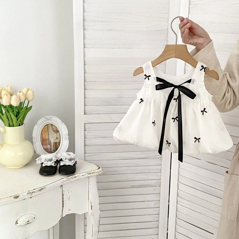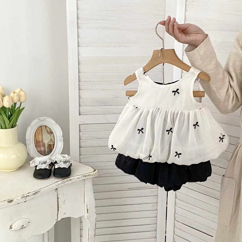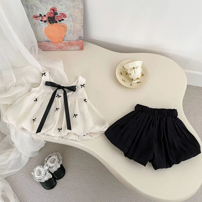 2025 New Western Style Girls' Summer Two Piece Set Super Fairy Bow Vest Top Versatile Flower Bud Shorts Set