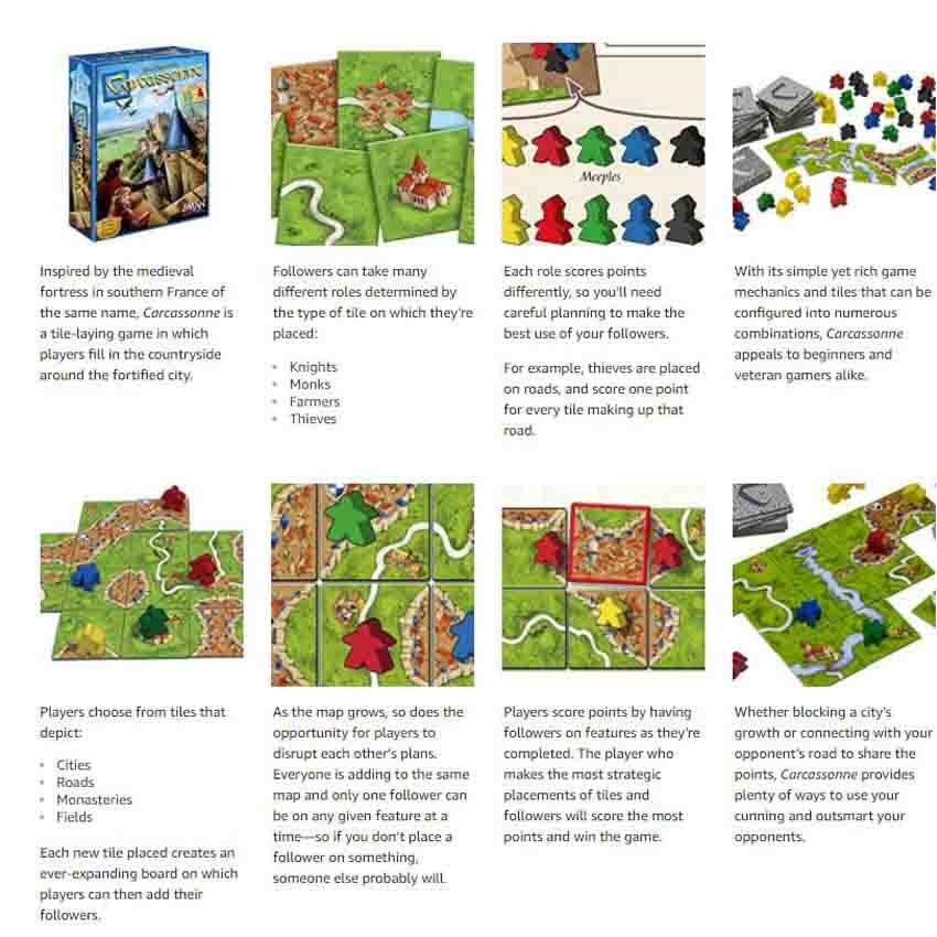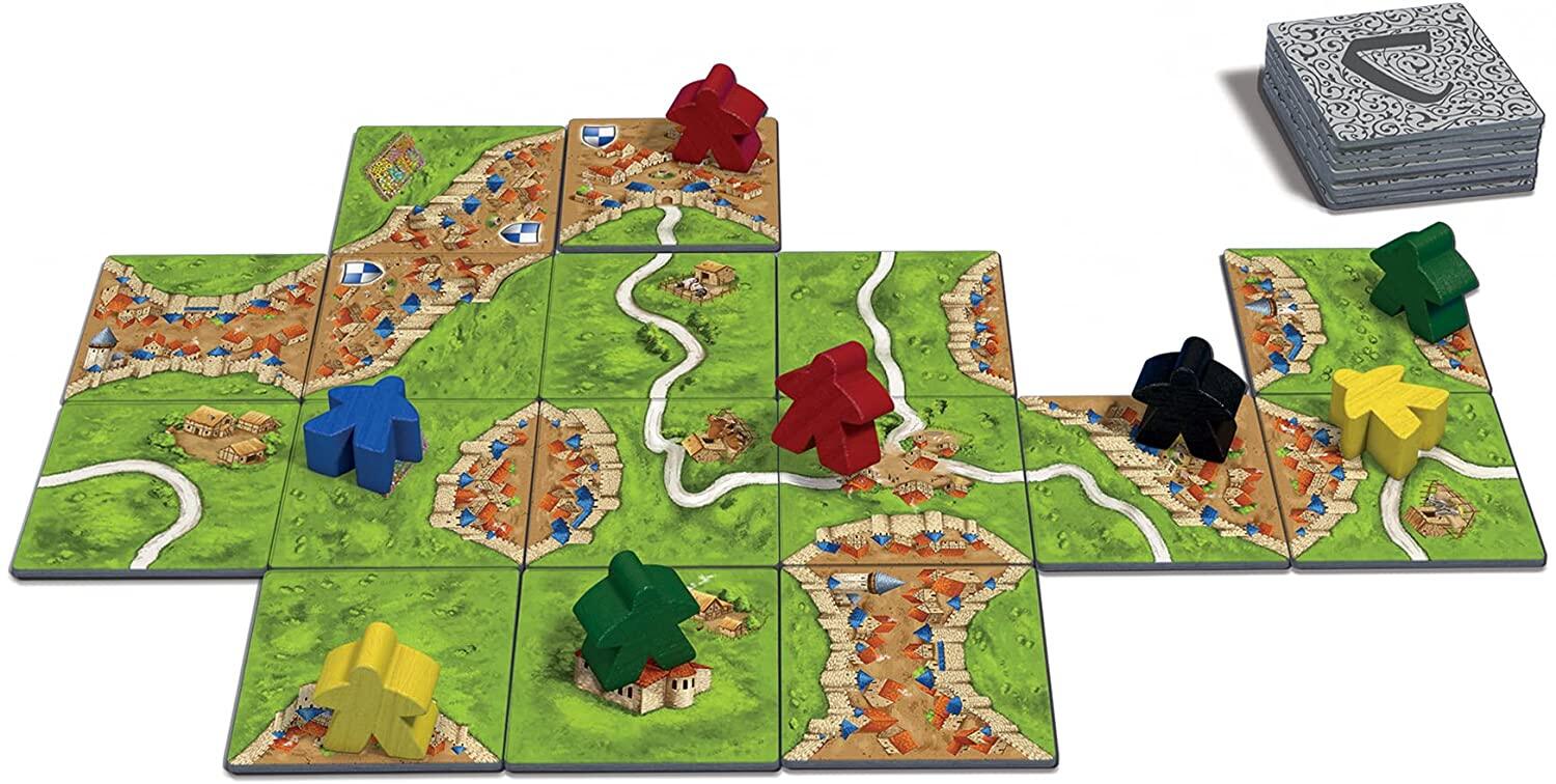 ONE STEP AT A TIME TILE-PLACEMENT GAME: Players fill in the countryside around the medieval fortified city, choosing from tiles that depict cities, roads, monasteries, and fields; each new tile creates an ever-expanding board on which players can then add their followers.