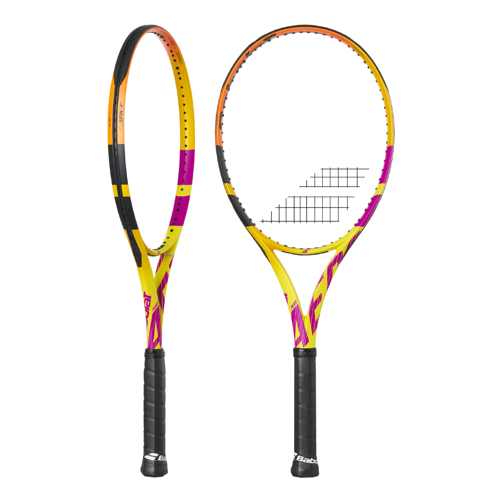 Rafael Nadal's very first signature racket- the Pure Aero Rafa was developed in collaboration with the 13-time Roland Garros champion by Babolat. Its exclusive new graphic design matches the player’s personality and distinctive gameplay. Nadal chose a combination of warm, explosive colors with dominant tones of yellow, purple and orange.