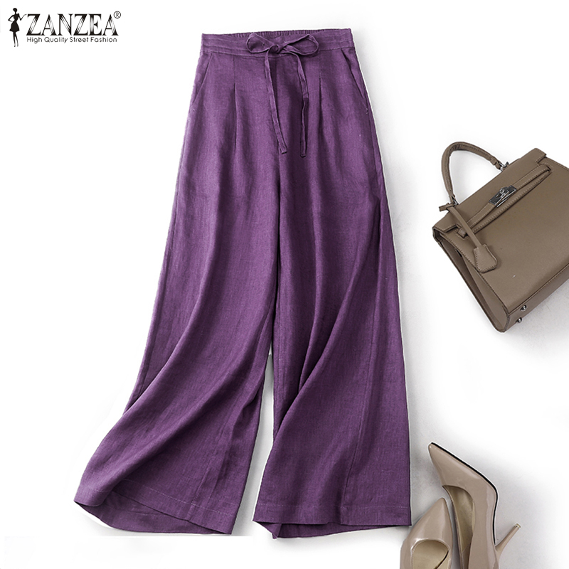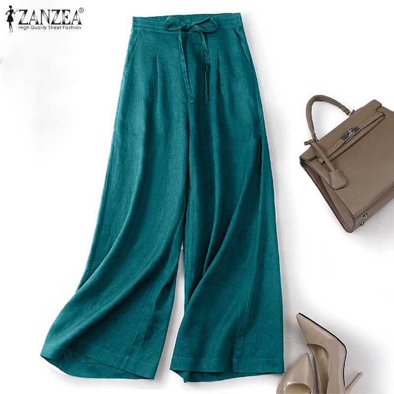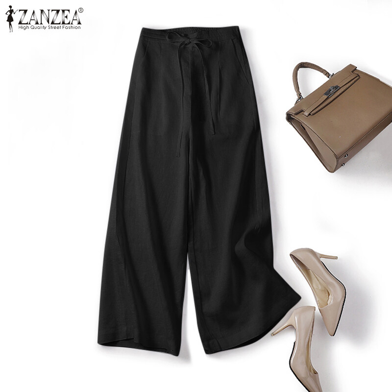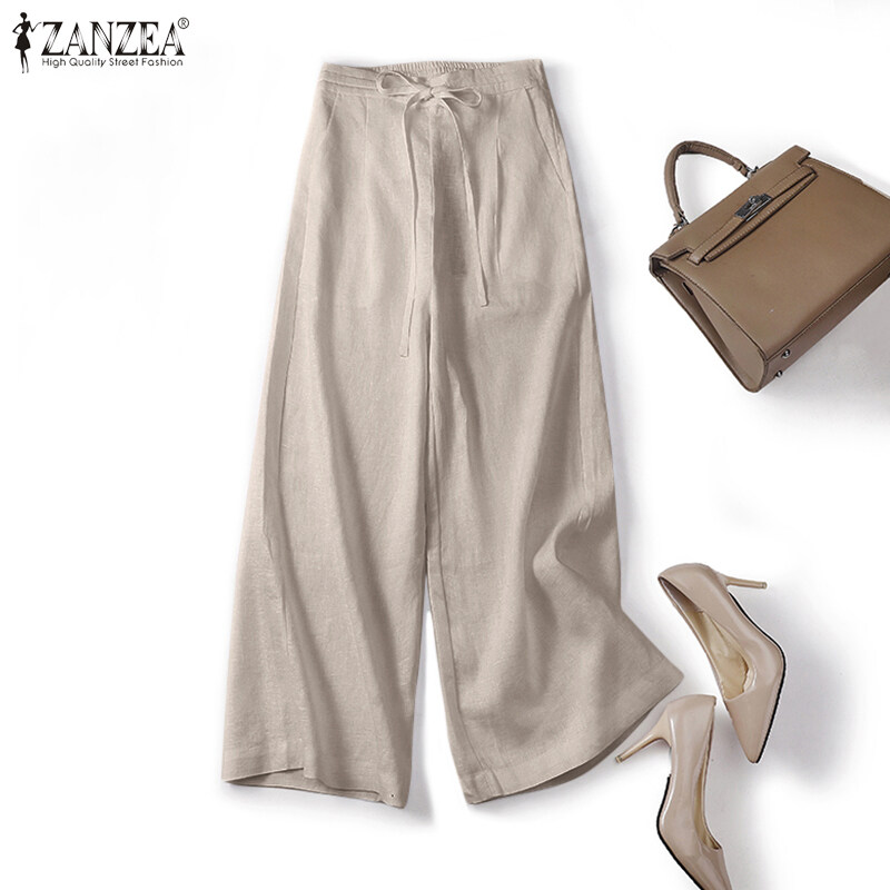 ZANZEA Women Drawstring Elastic Waist Plain Cotton Long Pants Loose Casual Trousers