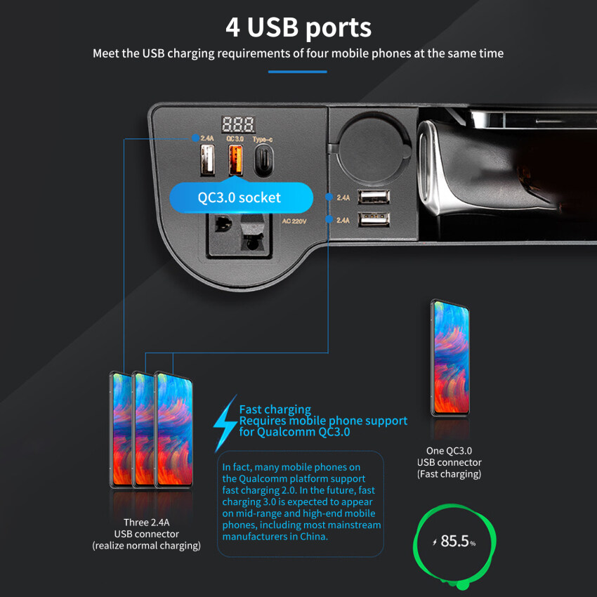 2. Suitable for 12V/24V cars, with multiple types of charging ports, including 3*2.4A USB ports, 1*QC3.0 fast charging USB port, 1*Type-C port, and 1*220V plug (compatible with European regulations, US Regulations and Australian regulations), 1*cigarette lighter interface.