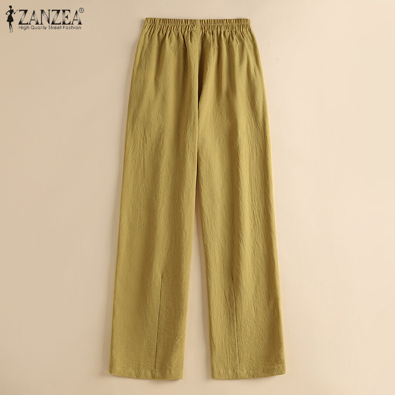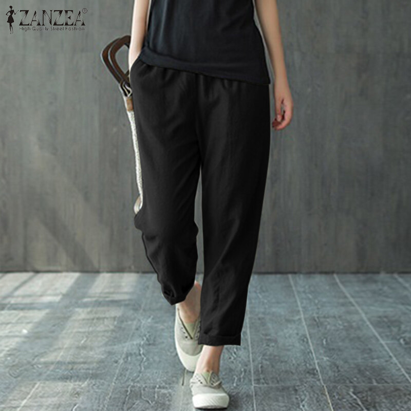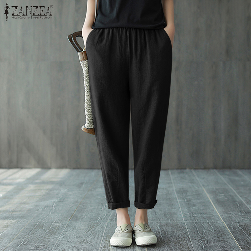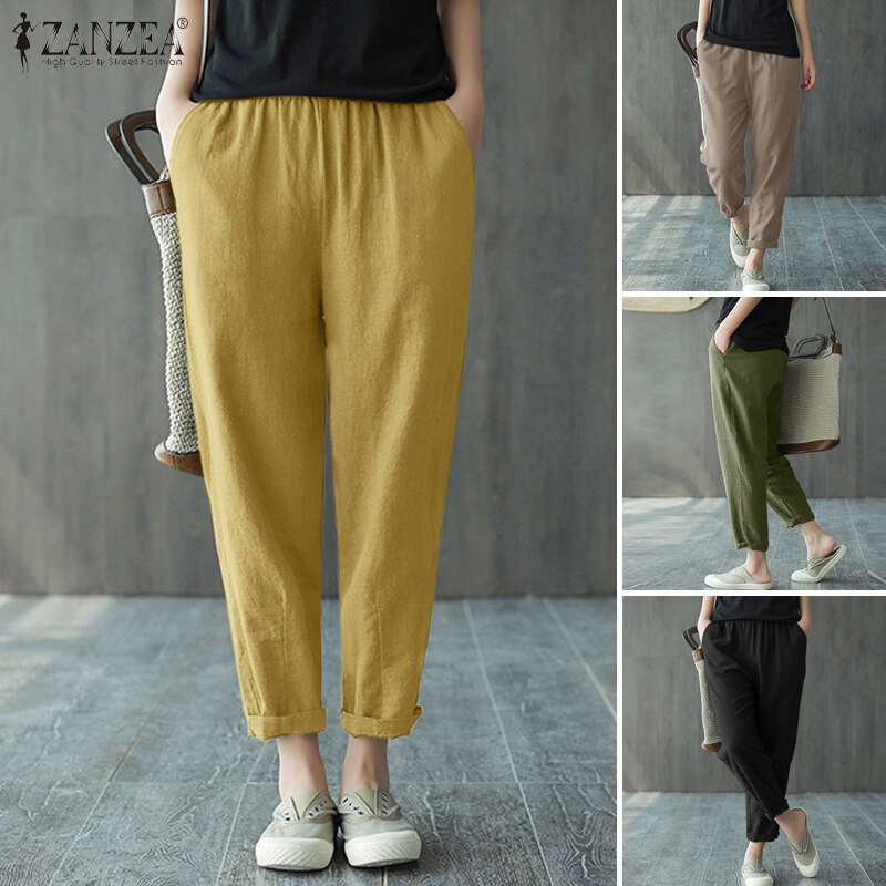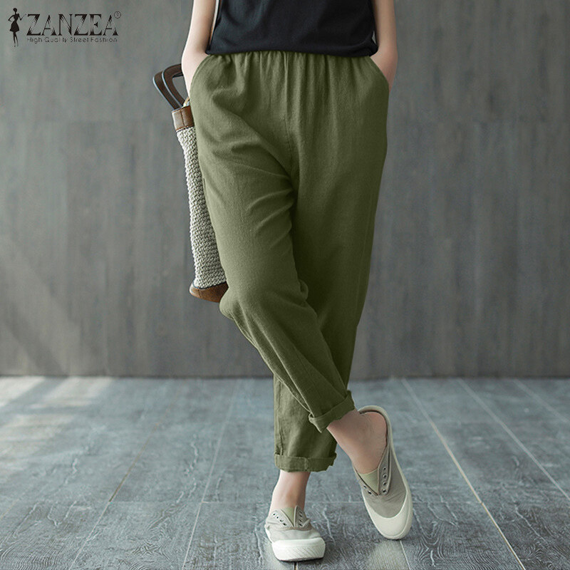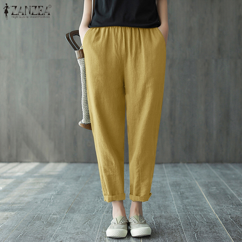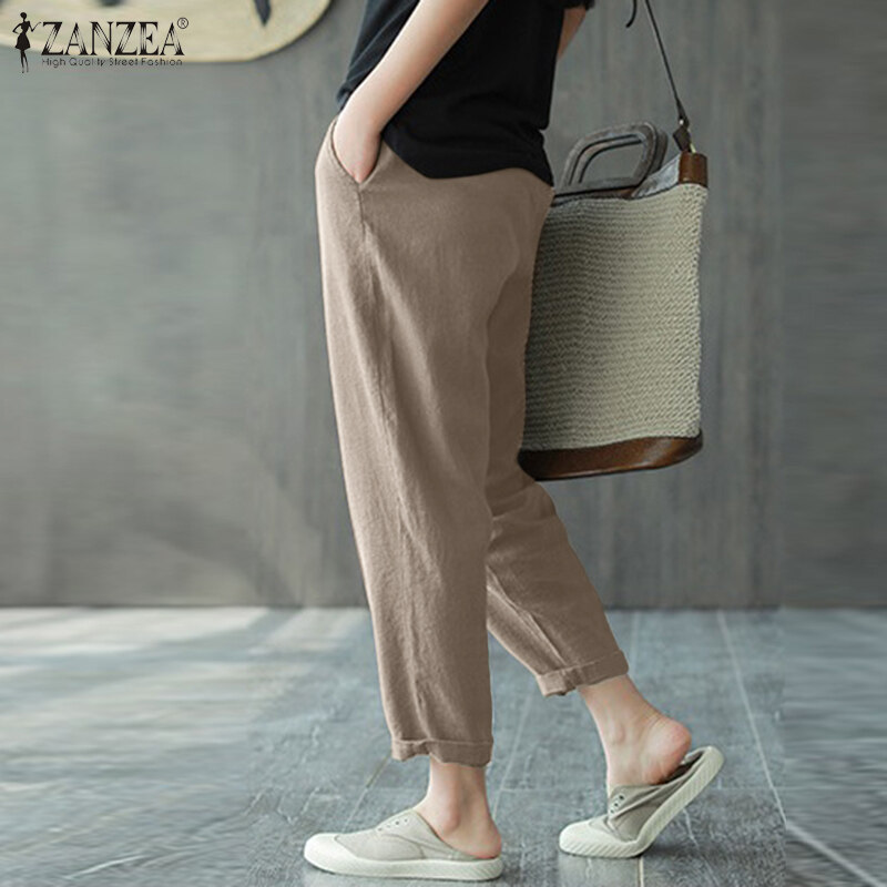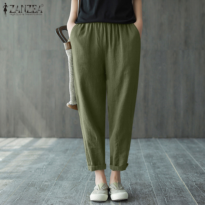 ZANZEA Women Leisure Simple Skinny Solid Pants Vintage Cotton Elastic Waist Trousers #8