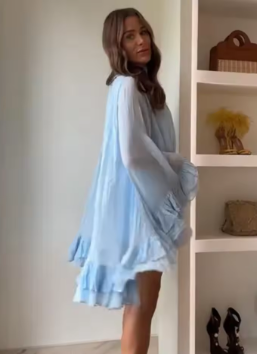 Fashion Blue Turtleneck Ruffles Mesh Mini Dress Women Elegant Pleated Loose Hem Short Dresses 2025 New High Street Vestidos