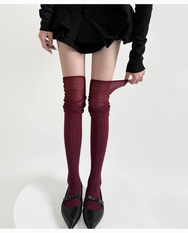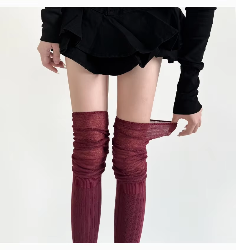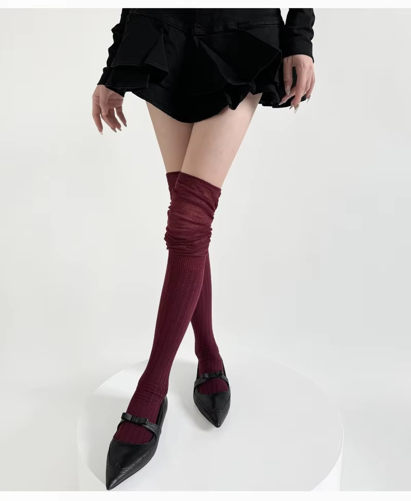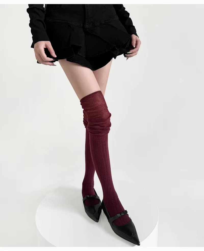 Girl Wine Red Stockings Vertical Stripes Silk Thin Cotton Long Tube Loose Socks Pile Knee-length Leg Warmers Women Runway JK