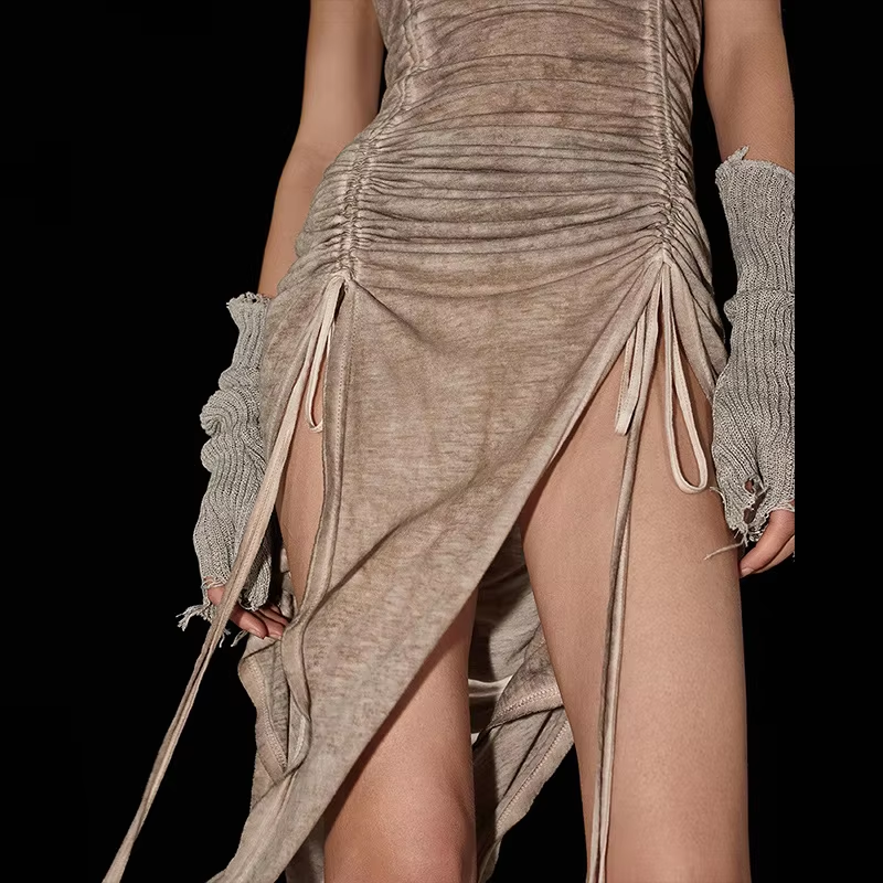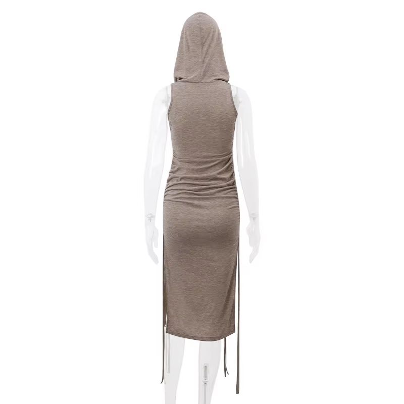 Gothic Desert Walker Hooded Dress Women Punk Split Side Midi Dress Medieval Vintage Cloak Vestidos Drawstring Fold Short Dresses