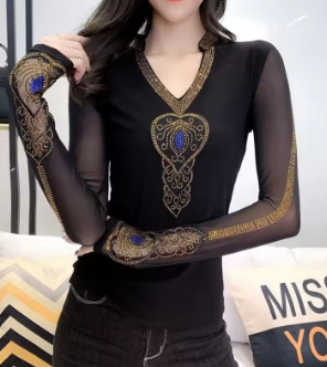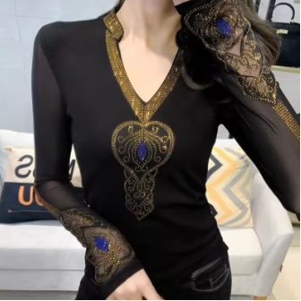 High Quality Autumn Fashion Women V-Neck Luxury Golden Hot Diamonds T-Shirt Sexy Long Sleeve Tops New Streetwear Girl Brand Tees