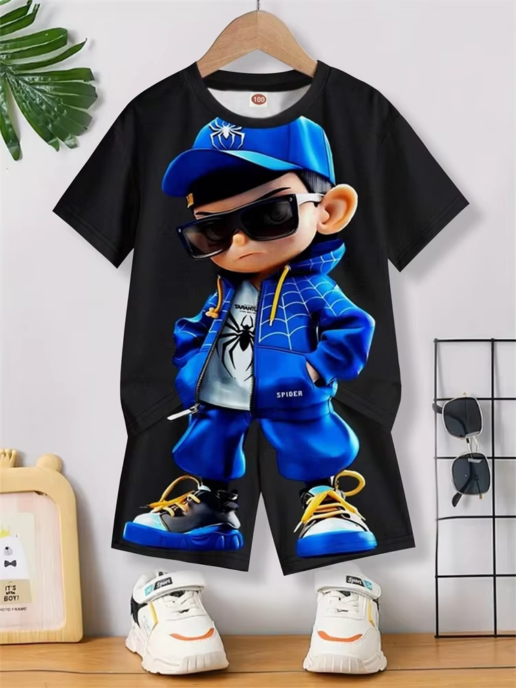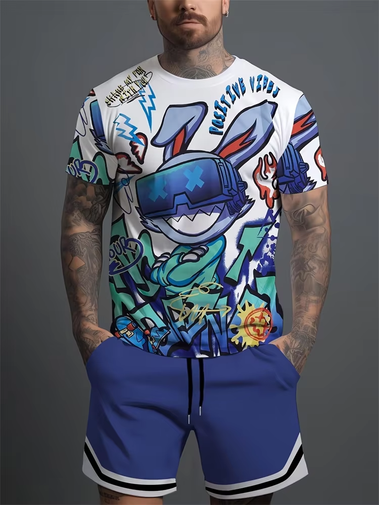 Interesting Cartoon 3D Printed Men's Round Neck Short Sleeve 2pcs Suit Urban Street Trend Men's Short Sleeve Top Trend Fashion