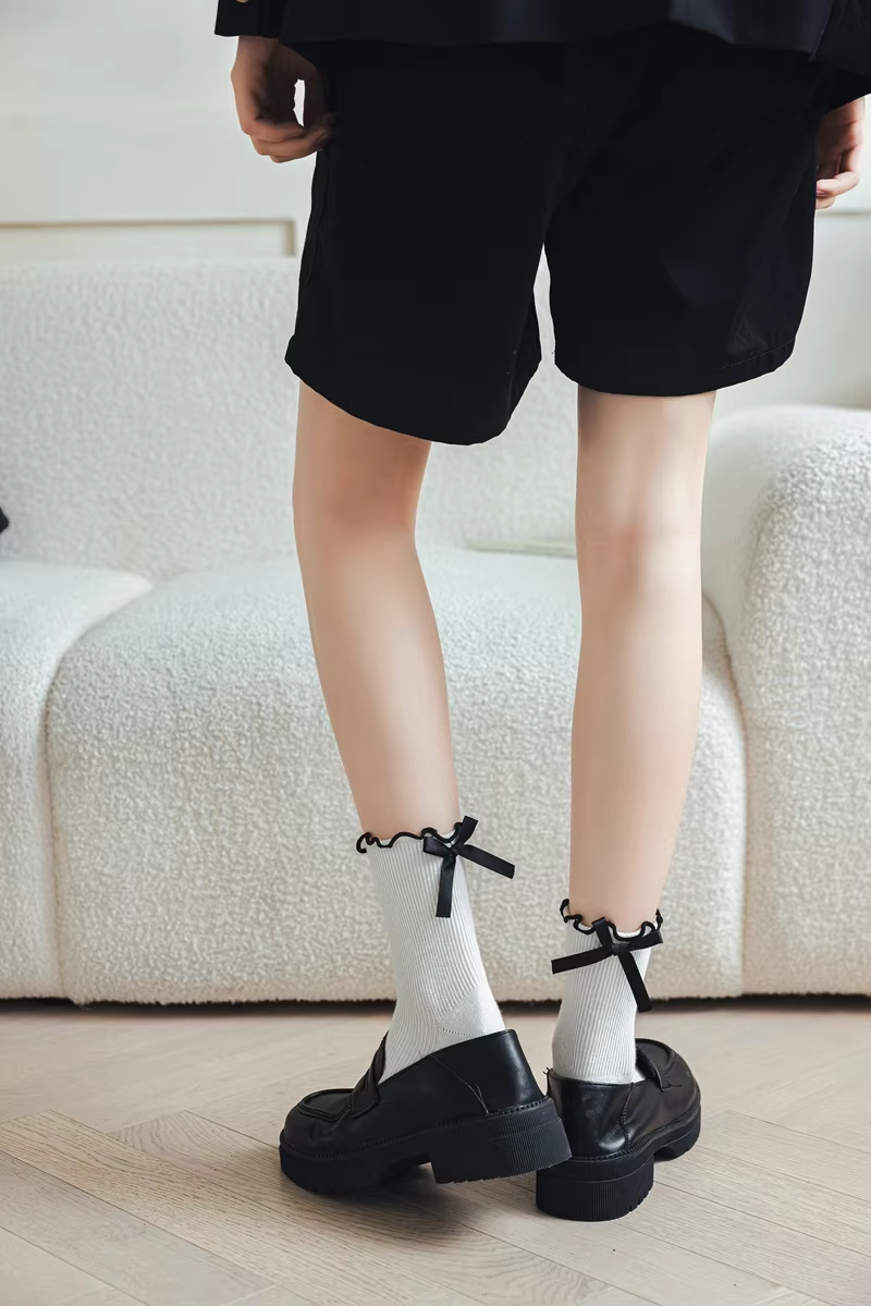 Japanese JK Sweet Bowknot Tied Middle Tube Socks Women Heel Bow Casual Black White Pile Socks Girls Sports Cotton Socks