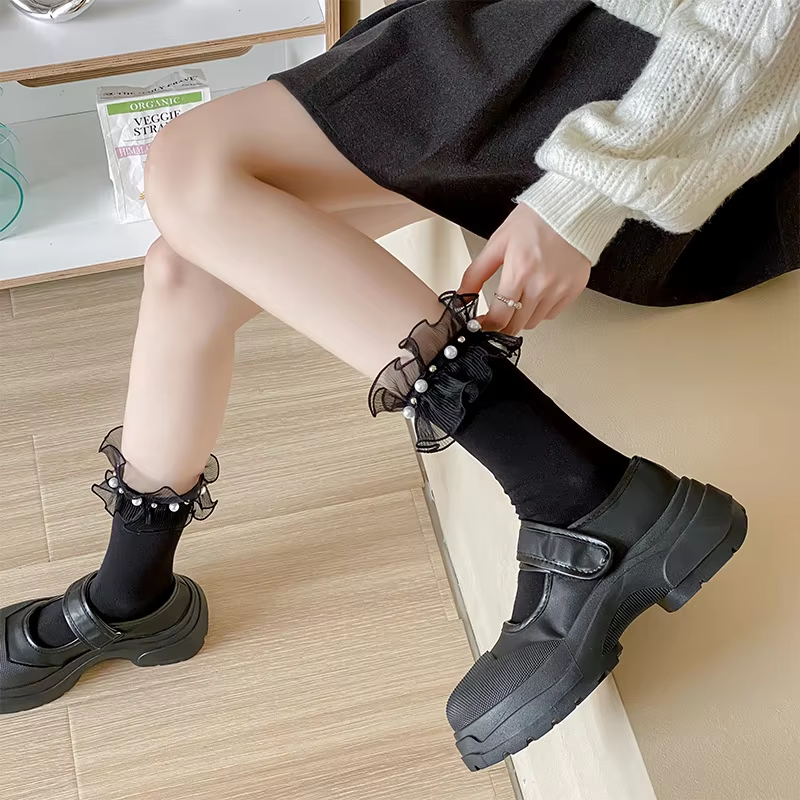 Lolita Lace Ruffle Socks Women Sweet Girls Pearl Kawaii Cute Princess Socks JK Japanese Style Solid Color Black White Long Socks