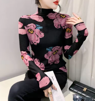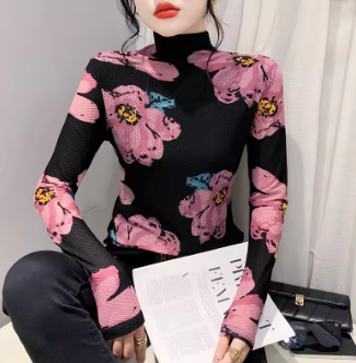 European Clothes Tshirt Women Turtleneck Fashion Print Slim Mesh Tops Long Sleeve Workwear Tees Autumn Winter