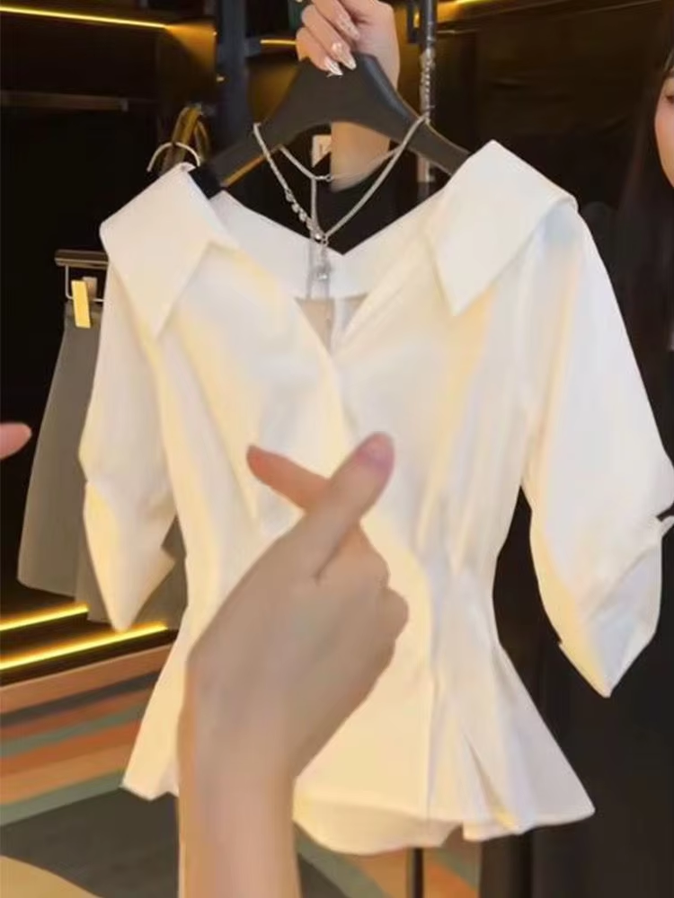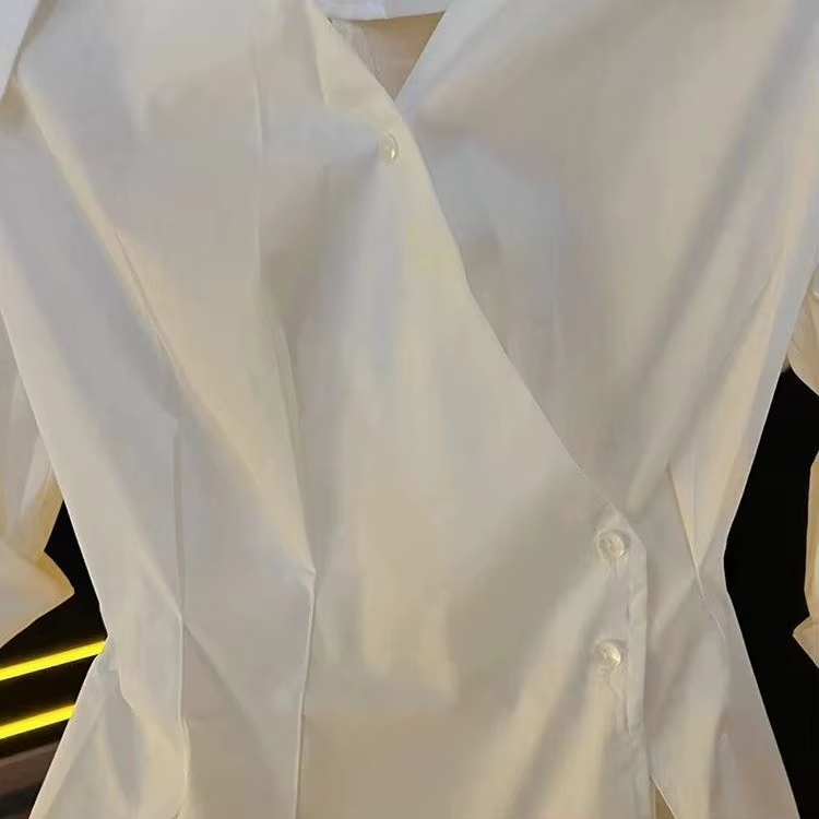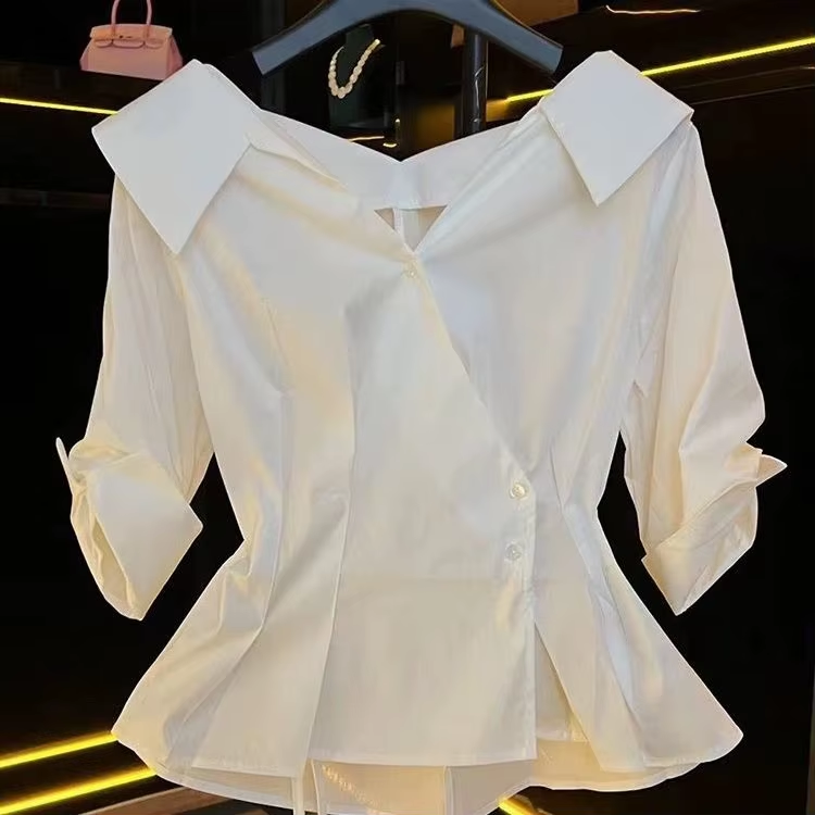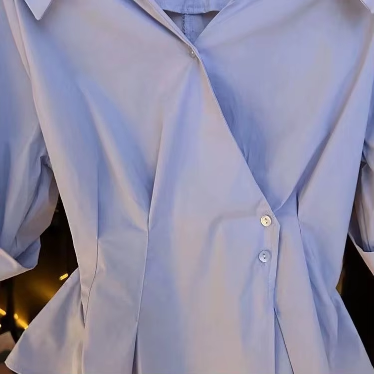 Oblique button V-neck short-sleeved shirt female summer new fashion irregular high-quality temperament shirt pleated slim top