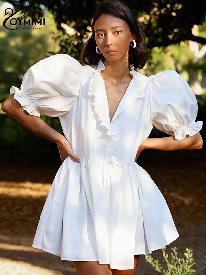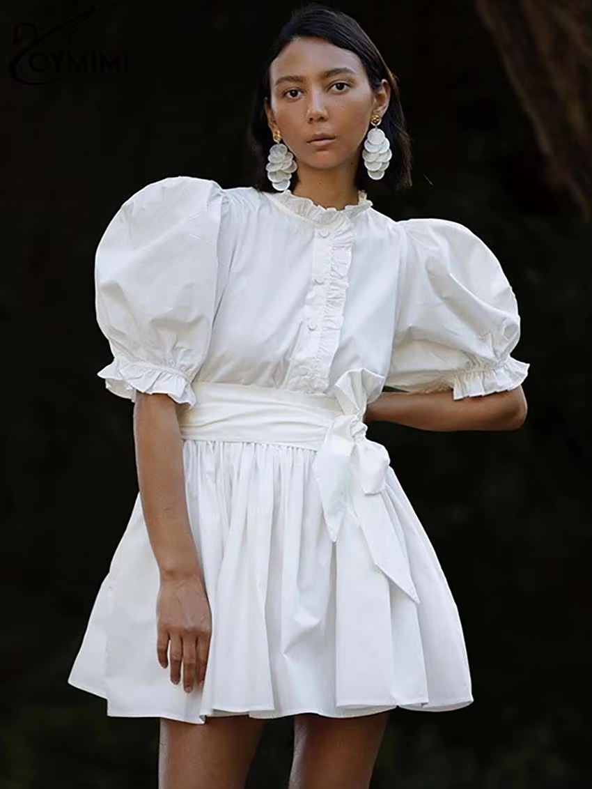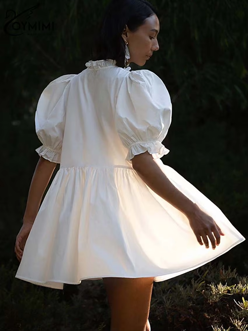 Oymimi Elegant White Loose Dresses For Women Fashion O-Neck Short Sleeve Button Dresses Casual High Waist Pleated Mini Dress