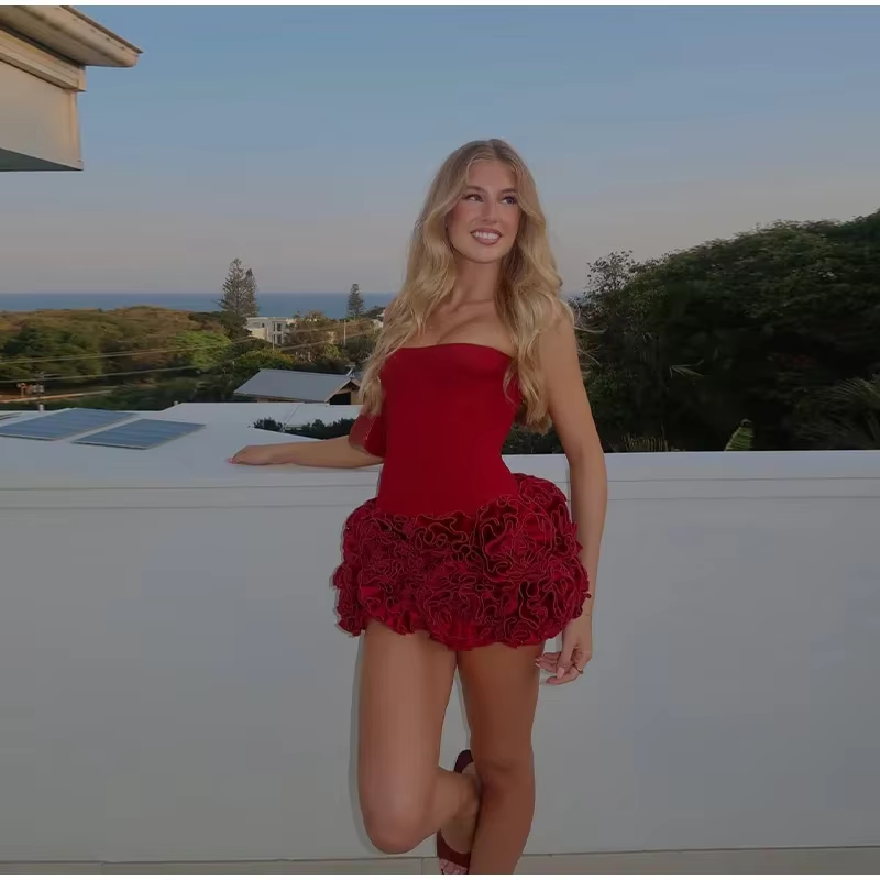Sexy 3D Flowers Red Short Party Dress Women Adjustable Fishbone Bandage Flower Patchwork Dresses 2025 Strapless Party Club Robes