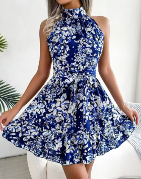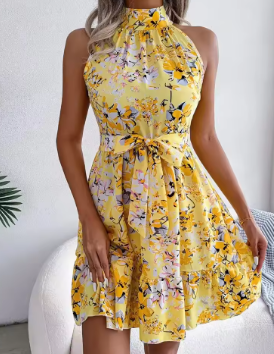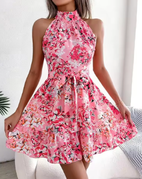 Sexy Spring Summer Floral Halter Neck Short Dresses Holiday Beach Sundress Casual Halter Short Dresses Clothes Women