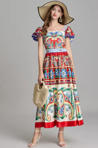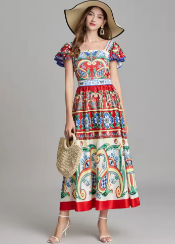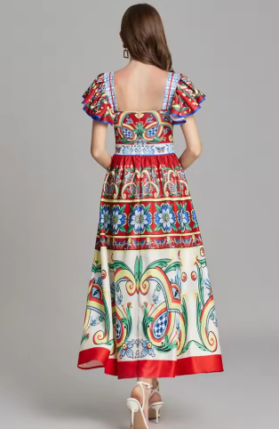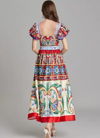 Summer Rumway Fashion Flower Print Long Dress Women Square Collar Flying Sleeve Elegant Backless High Waist Beach Party Vestidos
