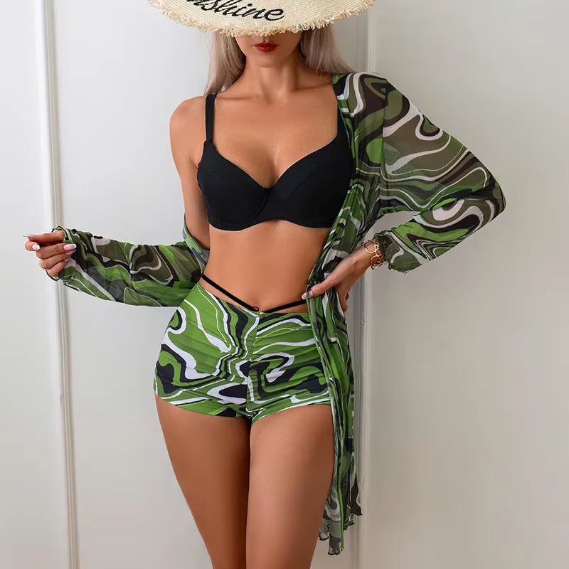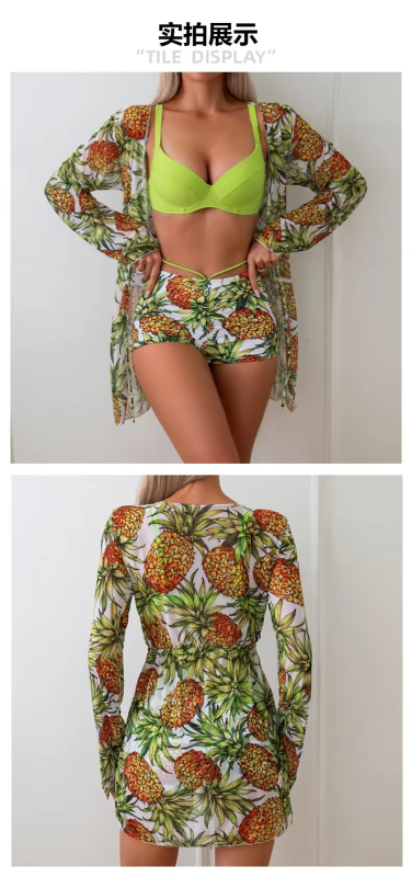 Women 3 Pack Print High Waist Bikini Sets Purple Swimsuit&Kimono Cover Ups Swimsuit Female Swimwear Push Up Beach Bathing Suits