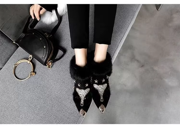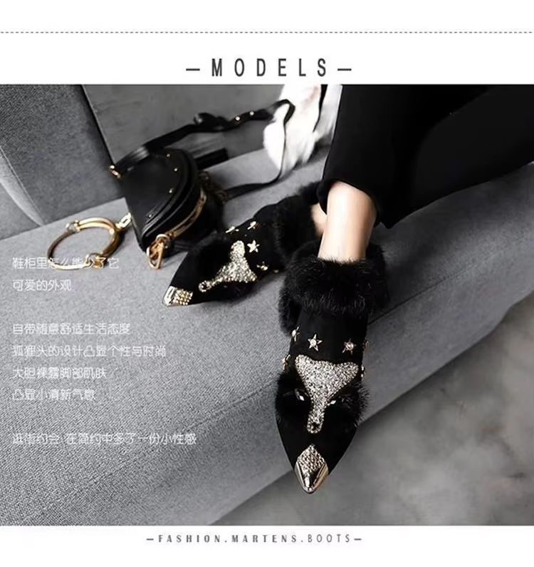 Women Ankle Boots Crystal Fox Head Women Boots 2025 Winter Fashion Metal Pointed Toe Fluffy Plush High Heel Wedding Party Shoe
