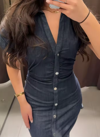 Women Denim V-neck Short Sleeved Long Dress Chic Slim Fit Single Breast Slit Vestidos New High Street Casual Solid Commuter Gown