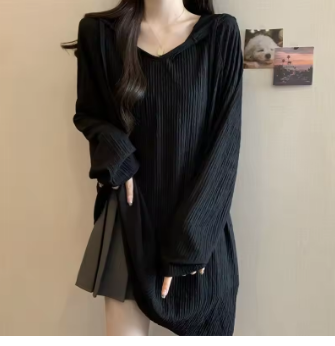 Women Trendy Simple Casual Oversize Hooded T-shirt Korean Solid V Neck Long Sleeve Tees Textured Chic Tunic Tops Female Clothing