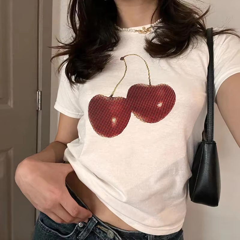 Y2K Cherry Bow Printed T Shirt Women Vintage T Shirt Trendy Cute Coquette Tee Shirt Short Sleeve Cottagecore