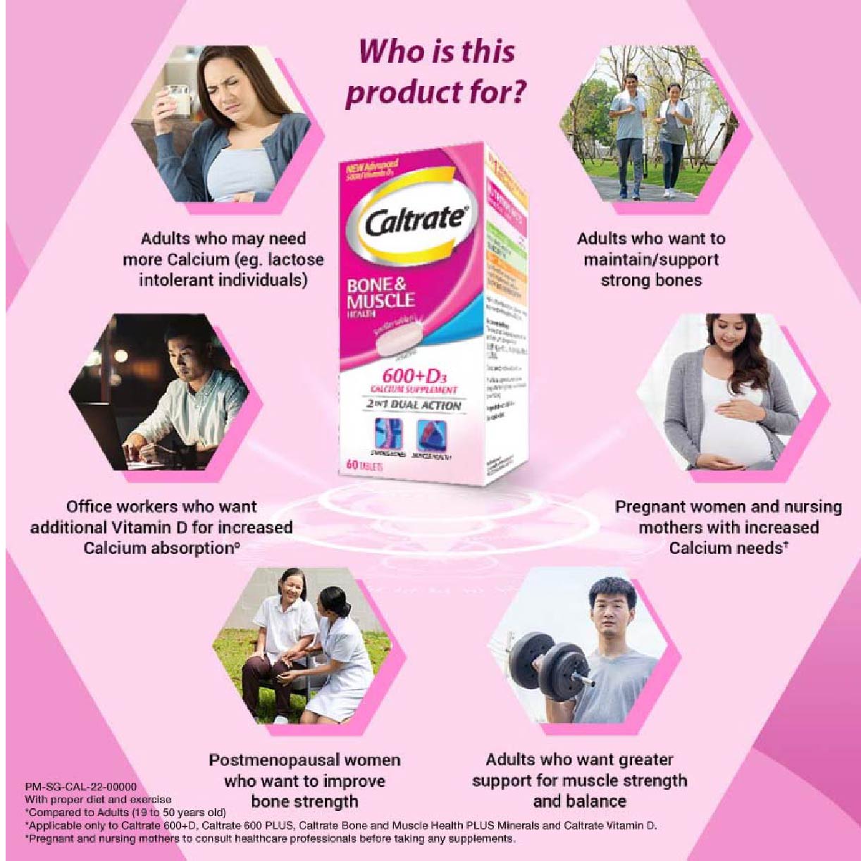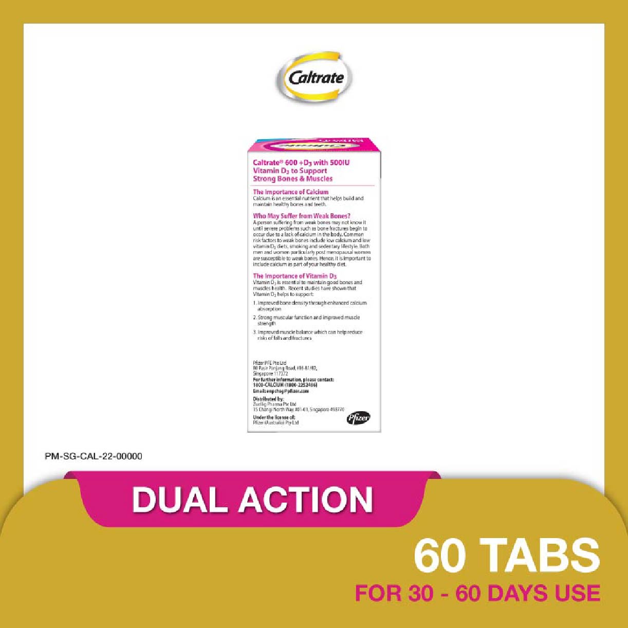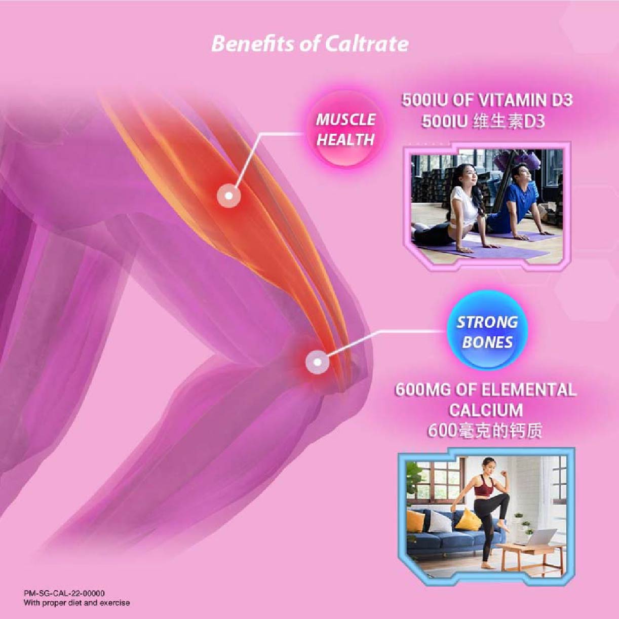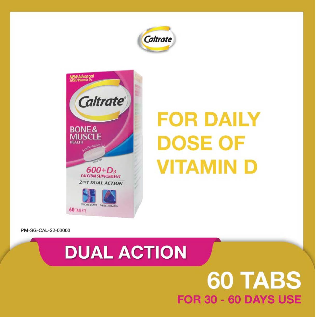 Caltrate® Bone & Muscle Health contains 600mg of Elemental Calcium for bone health and 500IU Vitamin D3 for good muscle health.