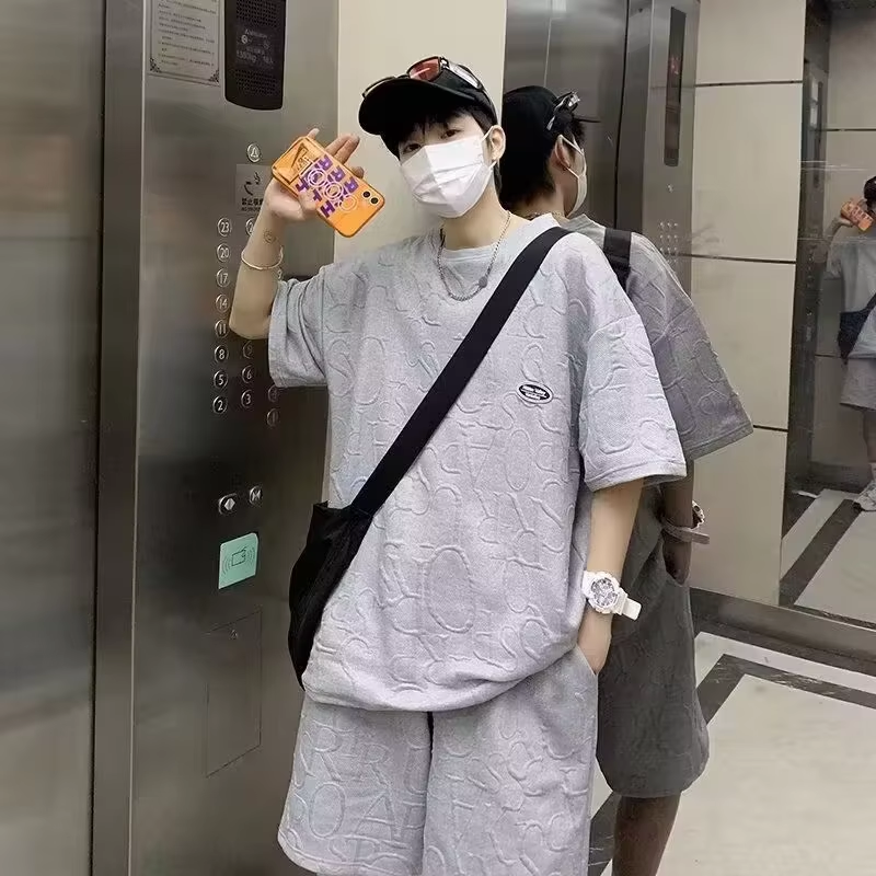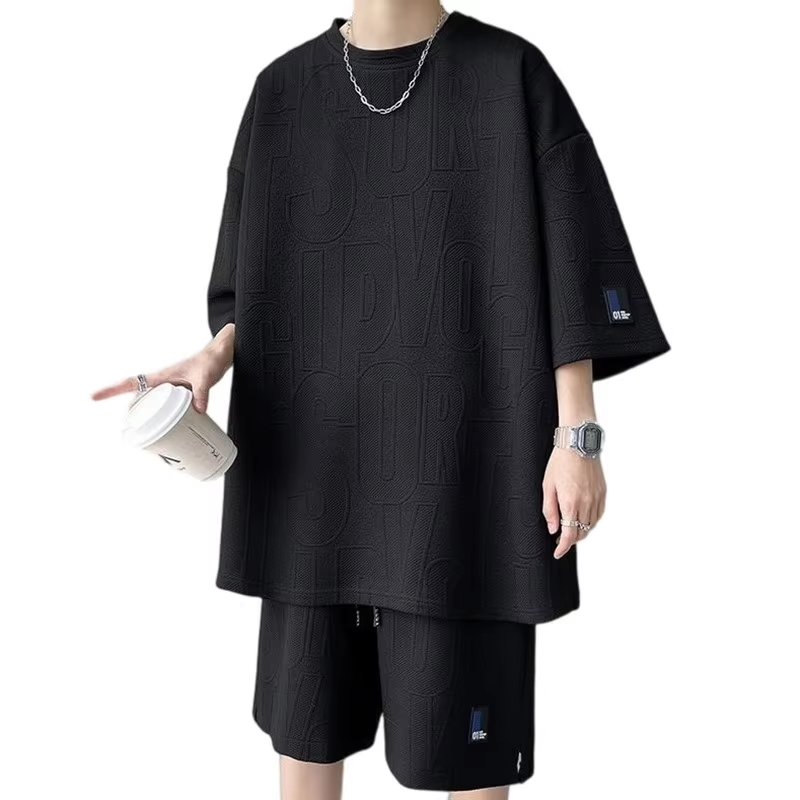 2025 NEW 3D Men's Waffle Summer Suit Casual T-shirt+Shorts Suit Tracksuit Solid color tracksuit loose suit Korean style trendy