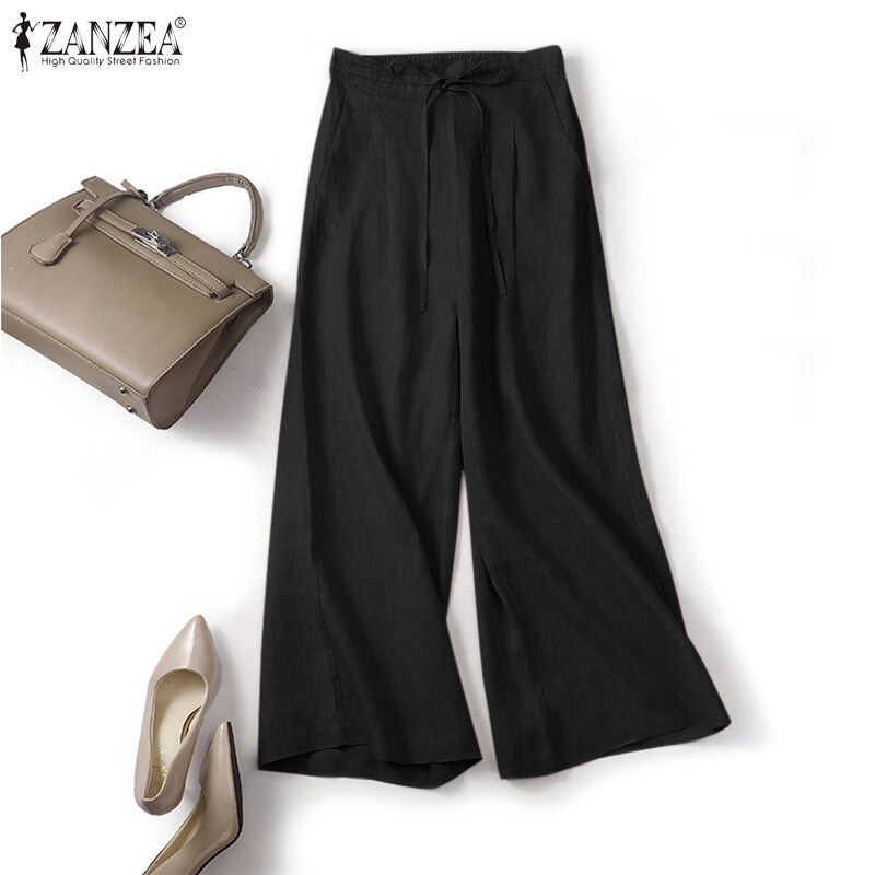 ZANZEA Women Drawstring Elastic Waist Plain Cotton Long Pants Loose Casual Trousers