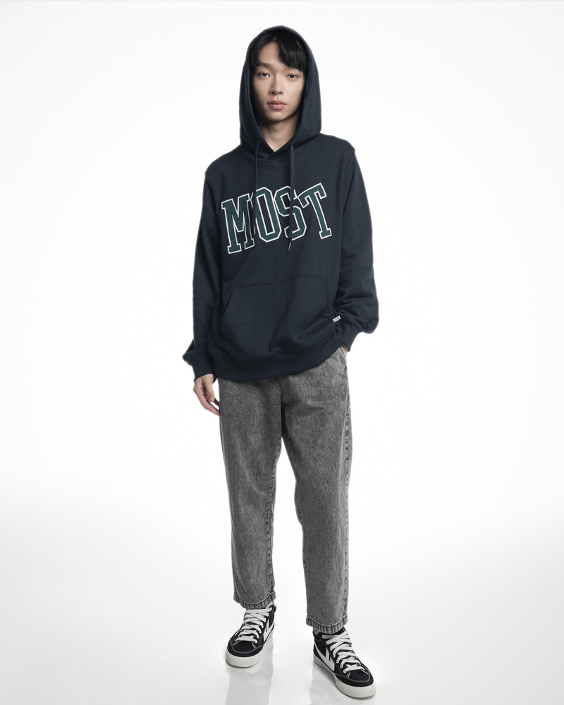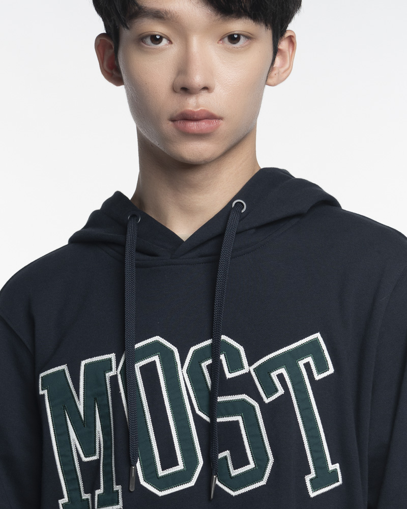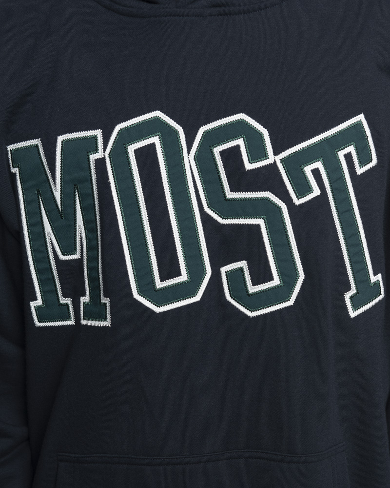 Regular Solid Coloured Long Sleeve Pullover Hoodie with Kangaroo Pockets at the front. Comes with MOST Slogan Patch at the front. Made of cotton.