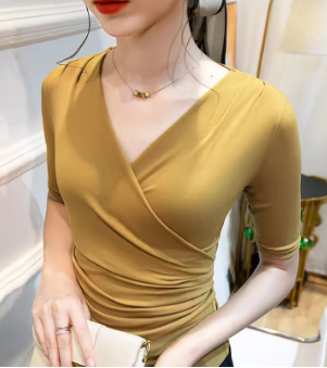 40-85kg Summer Thin Women Crossed V Neck Mesh T Shirts Lady Elegant Elastic Base Folds Tops Tees Female Half Sleeve T-Shirt