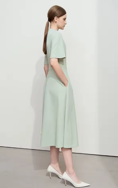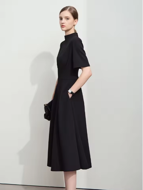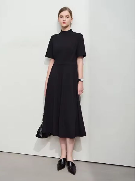 Amii Minimalist 2025 Spring New Short Sleeved Solid Elegant Commuter Stand Up Collar Splicing Waist Dress Drape Skirt 12541006