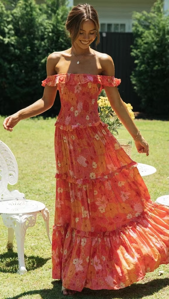 Bohemian Flowers Print Off Shoulder Long Dresses Women Fresh And Sweet Vacation Style Dress Fashion Beach Party Vestidos Female