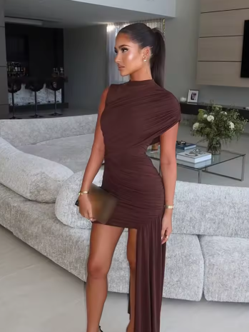 Brown Pleat Women Mini Vestidos Elegant Draped Ruched Turtleneck Sleeveless Slim Fit Dresses Summer Woman Club Party Short Dress