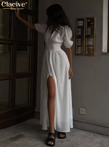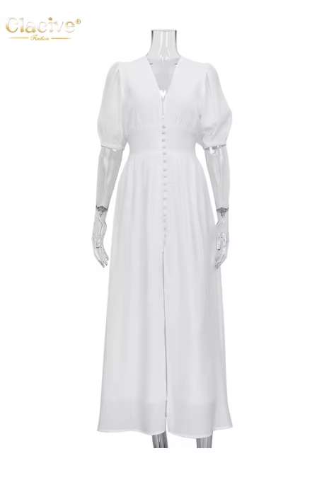 Clacive White Sexy Single-Breasted Women'S Dress 2022 Elegant Short Sleeve V-Neck Party Dresses Lady Casual Slim Midi Dress