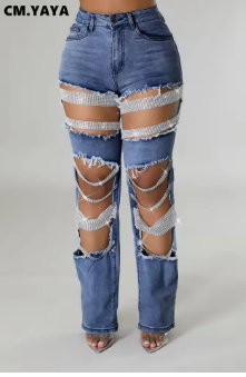 CM.YAYA Women Fashion Pearl Beading Ripped Hollow Out Tassel Wide Leg Jeans 2024 New Summer INS Street Denim Pants Trousers