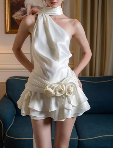 Fantoye Satin Sexy Backless 3D Flowers Women Dress White Halter A-line Dress Female Spring Slim Elegant Party Clubwear Vestidos