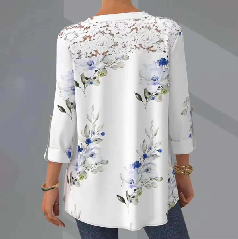 Fashion Summer Print Blouse with Lace Women Tops Casual V-neck Loose Half Sleeve Tops Hollow Out Shirt Clothes Blusas