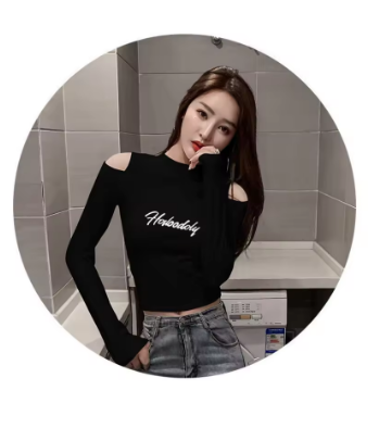 Korean Style Letter Printed Aesthetic Tee Shirt Sexy Off Shoulder Slim Short Tops Women Wild Long Sleeve Y2k Streetwear Crop Top