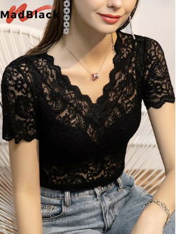 MadBlack Summer T-Shirt European Clothes Women Sexy V Necks Lace Tops Short Sleeves Bottoming Tees Spring New 2023