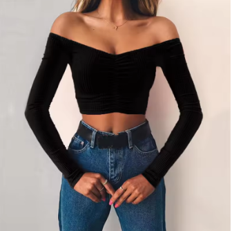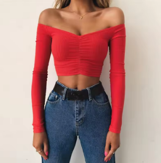 Off Shoulder Crop Top Women Summer Long Sleeve T Shirt V Neck tshirt Elegant Party Club Tee Shirt Femme Dames Streetwear