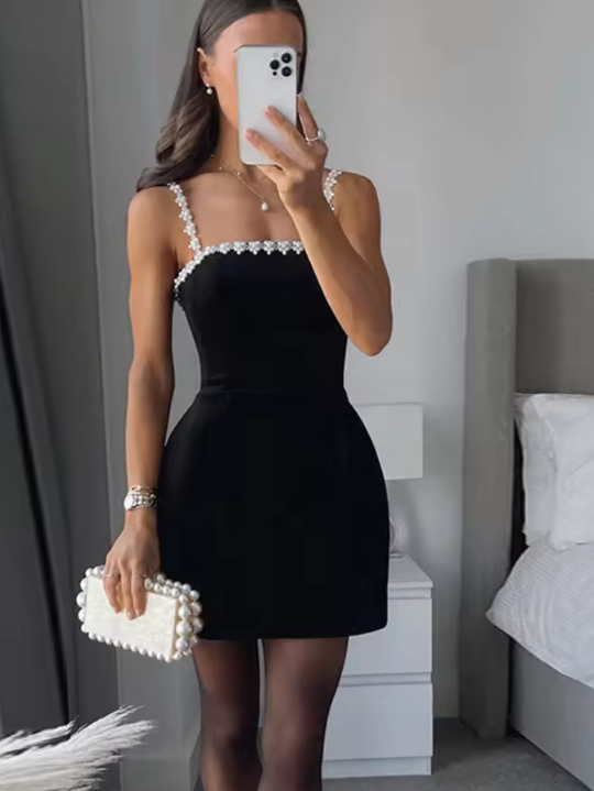 Pearl Velvet Mini Slip Dress Black Halter Sexy Slim Fit Waist Cinched Socialite Party Evening Gown Women Short A-Line Dresses