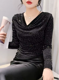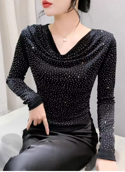 Stretchy Bling Tshirts Girls Long Sleeve Folds Collar Diamonds Tops Slim Women Autumn Tees T Shirts