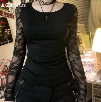 SUCHCUTE Black Gothic T-shirt For Women Sexy Club Lace Semi-see-through Long Sleeve Crop Tops Y2K Aesthetic 2000s Tee Autumn New