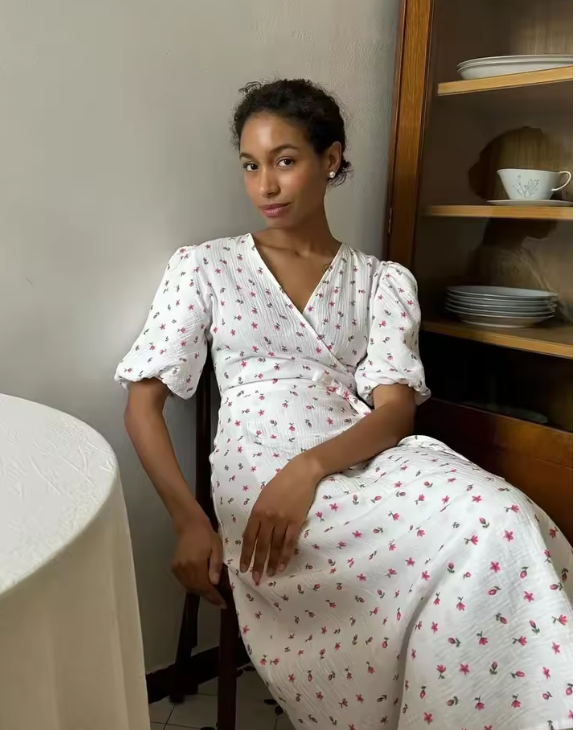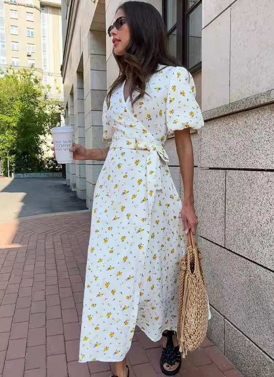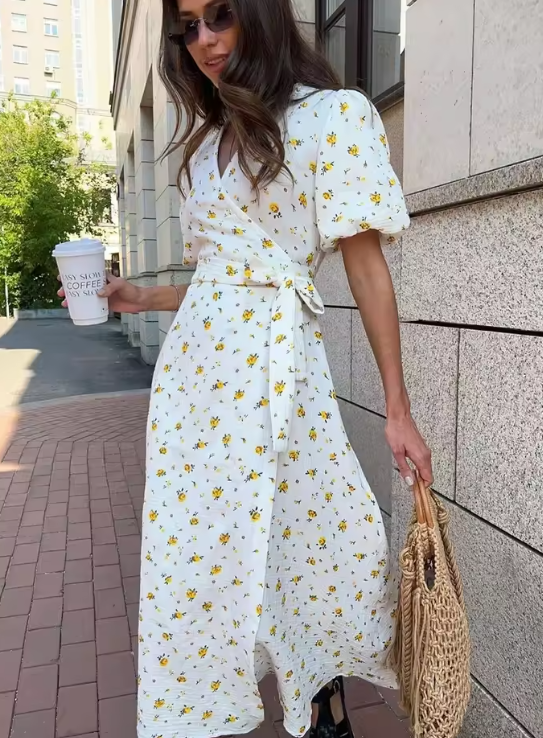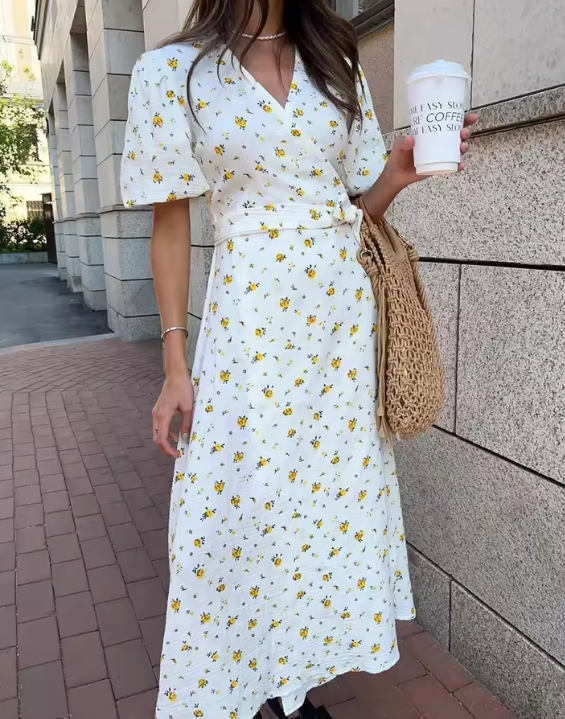 Wolfeel Summer Women Psrinted Dress Lace Up Short Sleeve Fashion Office Lady Long Dress 100% Cotton Daily Casual V-neck Skirt